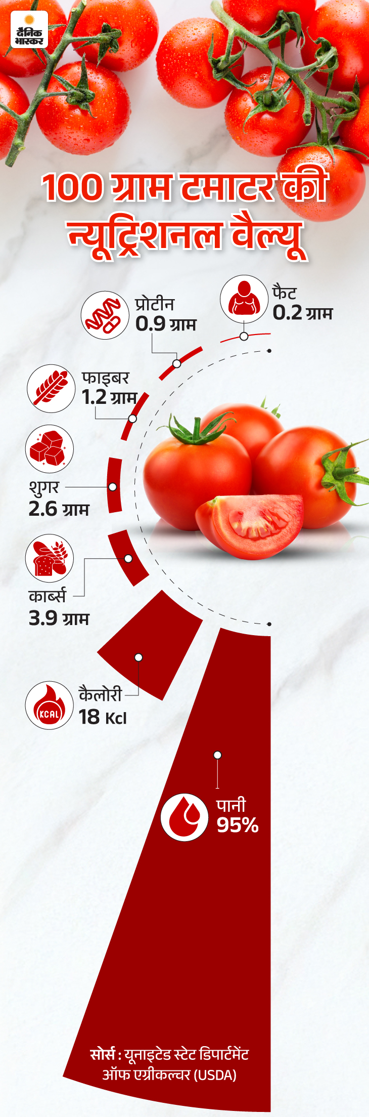 जवाब- टमाटर एक लो-कैलोरी और हाई-वाटर कंटेंट फूड है। इसलिए यह हेल्दी डाइट का अहम हिस्सा माना जाता है। 100 ग्राम टमाटर में लगभग 18-20 कैलोरी होती हैं। इसमें कार्बोहाइड्रेट कम होता है और फाइबर भरपूर मात्रा में होता है। इसमें फैट लगभग न के बराबर होता है।