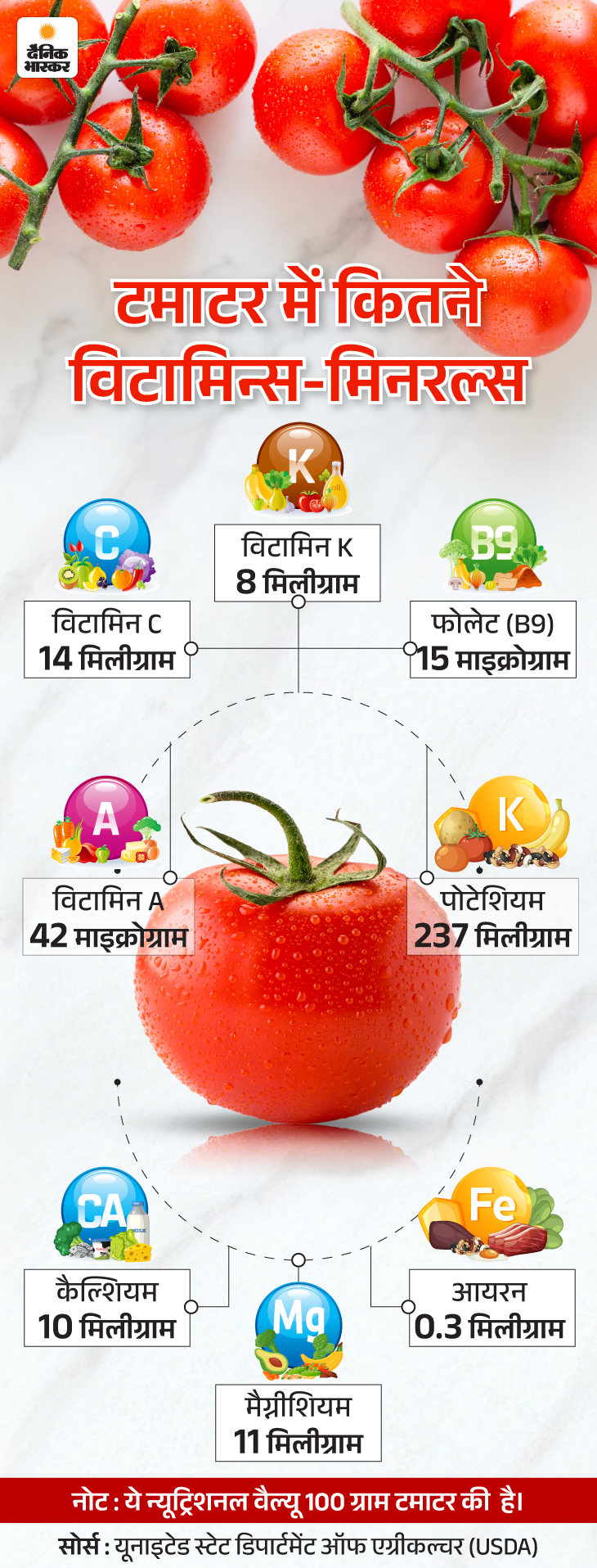 जवाब- टमाटर कई जरूरी विटामिन और मिनरल्स का अच्छा स्रोत है। इसमें विटामिन C भरपूर मात्रा में होता है, जो इम्यूनिटी मजबूत करने और शरीर में आयरन के अवशोषण में मदद करता है। विटामिन A आंखों और त्वचा की सेहत के लिए जरूरी है। सभी विटामिन और मिनरल्स ग्राफिक में देखिए।