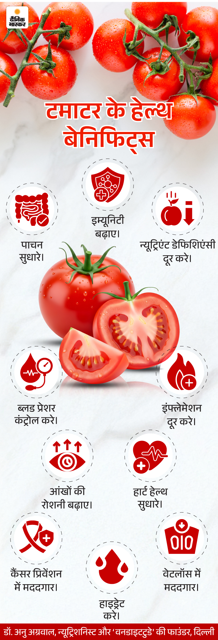 जवाब- टमाटर खाने से कई तरह के हेल्थ बेनिफिट्स होते हैं।