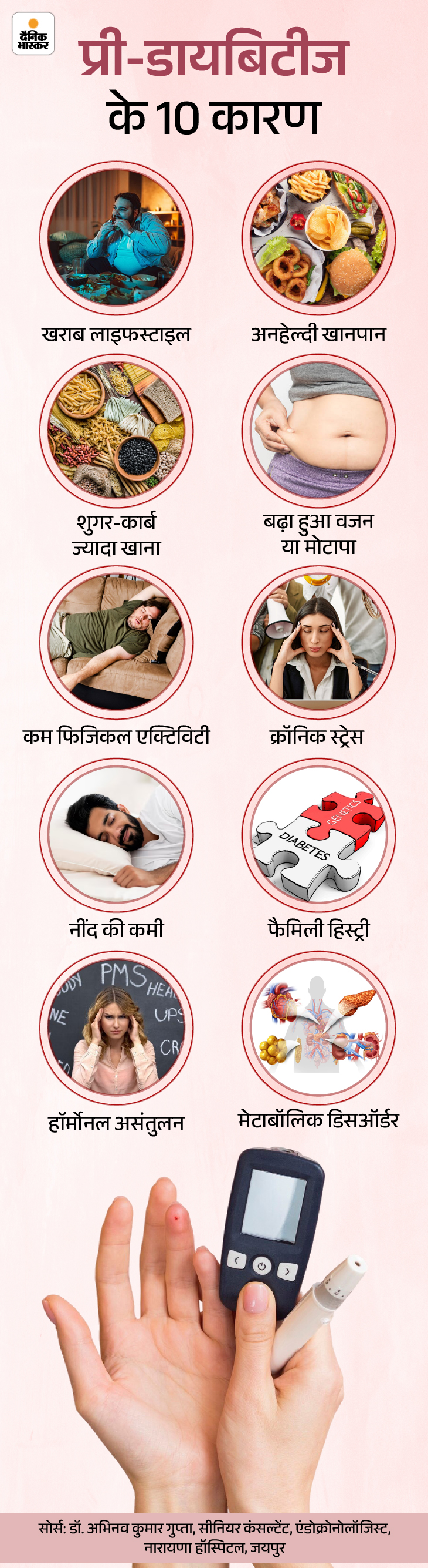 जवाब- प्री-डायबिटीज तब होती है, जब शरीर इंसुलिन का सही इस्तेमाल नहीं कर पाता है। इंसुलिन वह हाॅर्मोन है, जो ब्लड शुगर को कंट्रोल रखता है। जब शरीर इंसुलिन के प्रति रेजिस्टेंट हो जाता है या पैंक्रियाज पर्याप्त इंसुलिन नहीं बना पाता तो ब्लड शुगर धीरे-धीरे बढ़ने लगता है और यह स्थिति प्री-डायबिटीज कहलाती है। इसके पीछे कई कारण हो सकते हैं। इसे नीचे दिए ग्राफिक से समझिए-