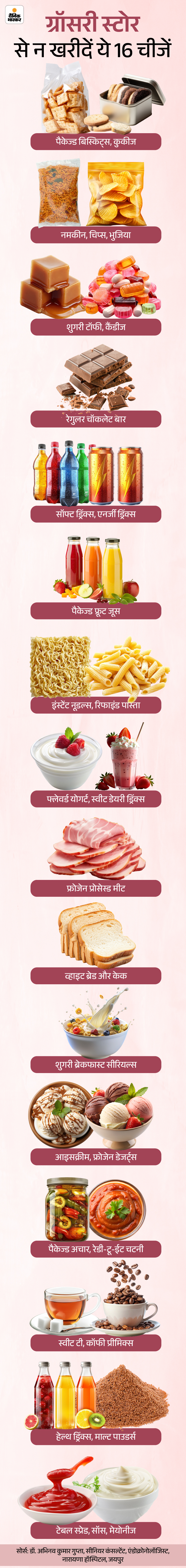 अगर आप सुपरमार्केट में खरीदारी करने जाते हैं तो नीचे दिया ग्राफिक आपके लिए बहुत महत्वपूर्ण है। इसमें उन चीजों की लिस्ट दी है, जो आपको कभी नहीं खरीदनी चाहिए। खासतौर पर अगर आपकी रीसेंट ब्लड टेस्ट रिपोर्ट ये कह रही है कि आप प्री-डायबिटिक हैं। लिस्ट देखें–