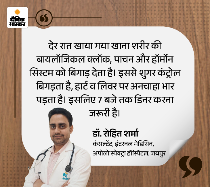 इंटरनेशनल जर्नल ऑफ फूड, न्यूट्रिशन एंड डायटेटिक्स में प्रकाशित 2023 की एक स्टडी बताती है कि लेट-नाइट भोजन कई गंभीर हेल्थ रिस्क बढ़ा सकता है, जैसे हाई ब्लड शुगर, ओबिसिटी और हार्ट डिजीज का खतरा। स्टडी के मुताबिक, जब हम लगातार देर रात खाना खाते हैं, तो डाइजेस्टिव प्रोसेस धीमा पड़ जाता है।