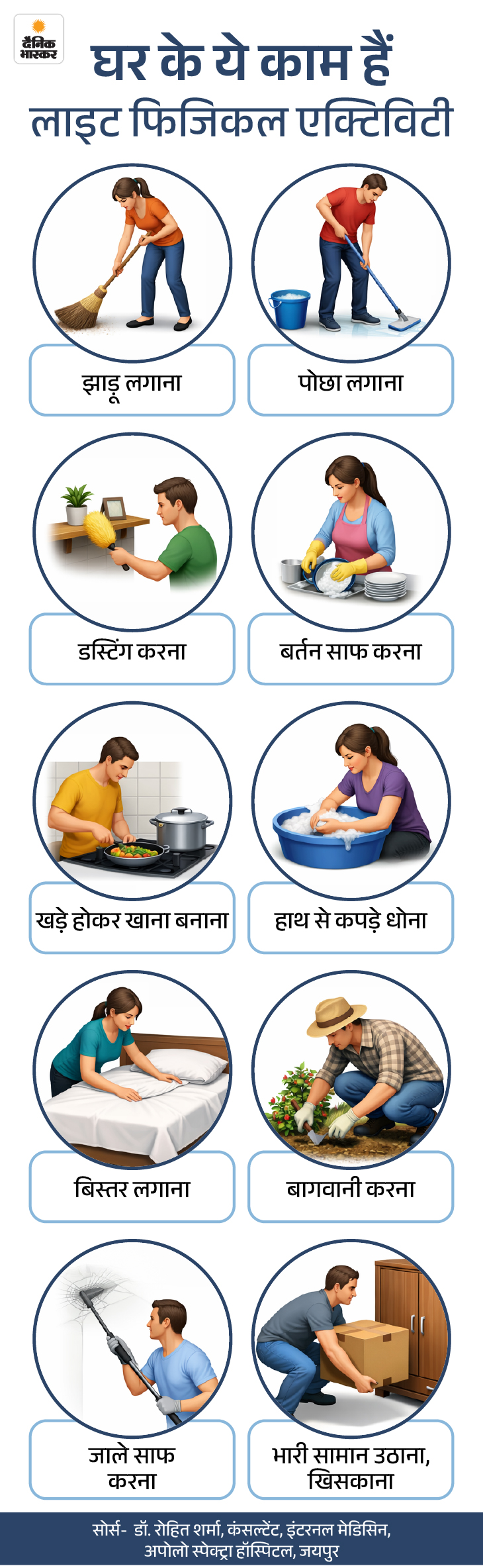 जवाब- हां, ये सब लाइट फिजिकल एक्टिविटीज ही हैं क्योंकि इनमें बॉडी मूवमेंट की जरूरत होती है। घरेलू काम करते रहने से हार्ट रेट नॉर्मल रहती है। अगर रेगुलर ये काम करते हैं तो कैलोरी बर्न होती है। लाइट फिजिकल एक्टिविटी जॉइंट मूवमेंट और मसल एक्टिवेशन में भी मदद करती है। ग्राफिक से समझते हैं कि इसमें कौन-कौन सी एक्टिविटीज शामिल होती हैं-