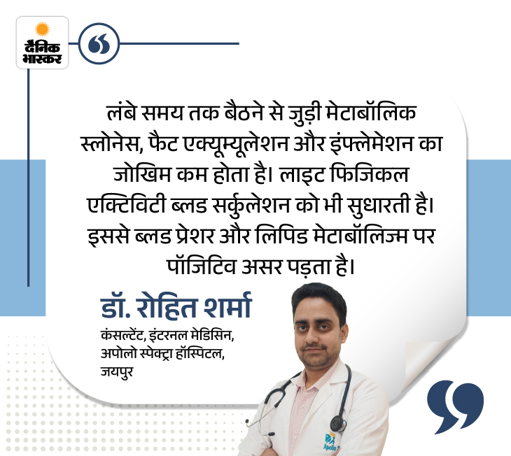सवाल- लंबे समय तक बैठकर काम करने वालों के लिए बीच-बीच में हल्का मूवमेंट क्यों जरूरी माना जाता है? जवाब- लगातार बैठे रहने से मांसपेशियों की एक्टिविटी कम हो जाती है। ब्लड सर्कुलेशन धीमा पड़ता है और शरीर का मेटाबॉलिज्म सुस्त होने लगता है। उठकर थोड़ा चलना, स्ट्रेच करना या पोजिशन बदलना मसल्स को दोबारा एक्टिव करता है, जिससे ग्लूकोज का इस्तेमाल बेहतर होता है और ब्लड फ्लो सुधरता है। साथ ही यह पीठ, गर्दन और जोड़ों पर पड़ने वाले दबाव को कम करता है।