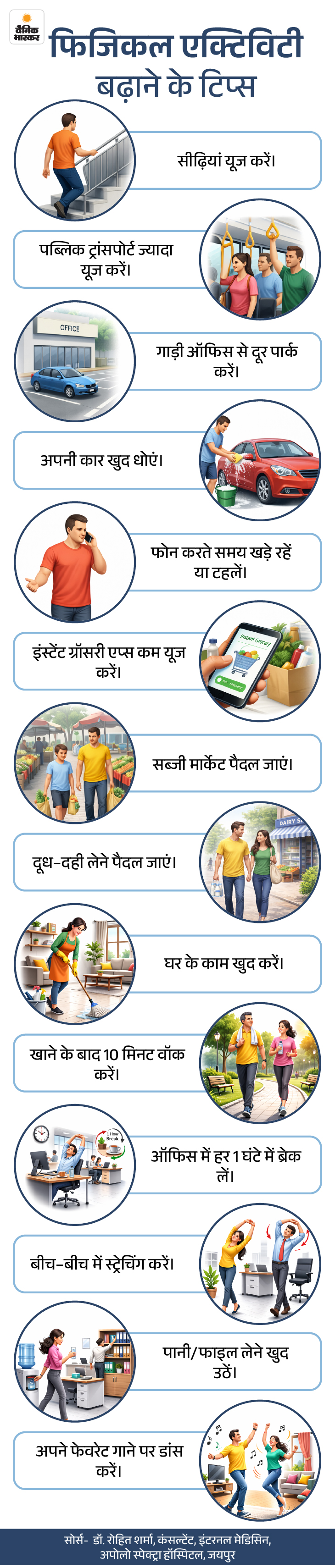 जवाब- फिजिकल एक्टिविटी बढ़ाने के लिए जिम या हार्ड एक्सरसाइज ही जरूरी नहीं होती। रोजमर्रा की छोटी-छोटी आदतों में थोड़ा बदलाव करके भी शरीर को एक्टिव रखा जा सकता है। ग्राफिक से समझते हैं-