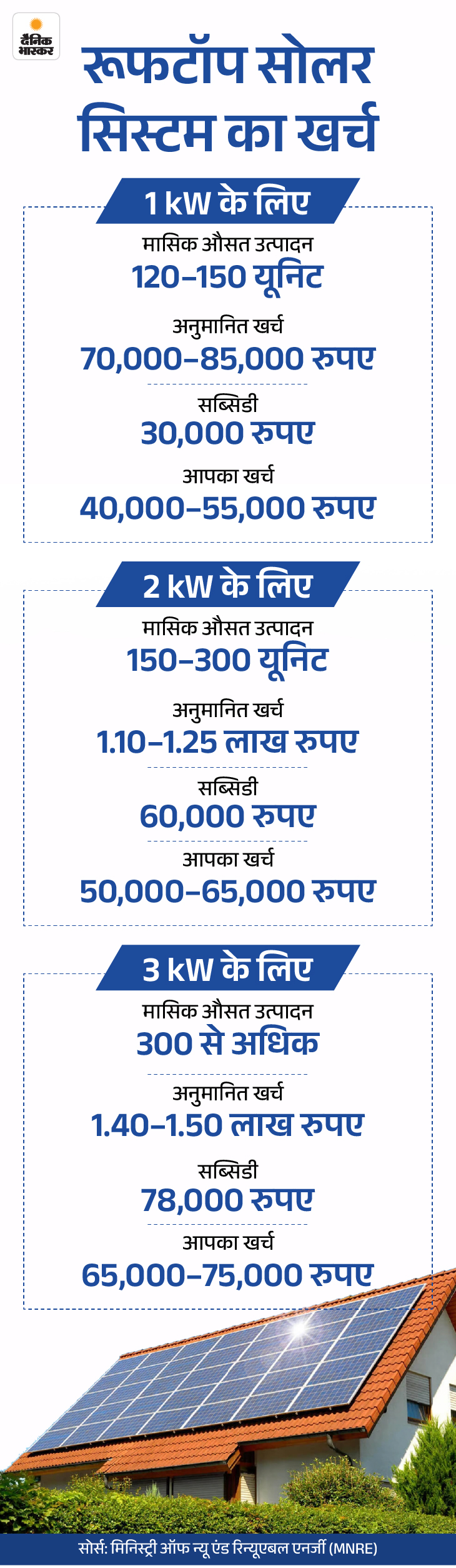 जवाब- इसका खर्च सिस्टम की क्षमता (जैसे 1, 2, 3 किलोवाट), पैनल और इन्वर्टर की क्वालिटी व इंस्टालेशन चार्जेस पर निर्भर है। हालांकि सरकार इसके इंस्टॉलेशन पर सब्सिडी भी देती है। इससे लागत थोड़ी कम हो जाती है। इसे नीचे दिए ग्राफिक से समझिए-