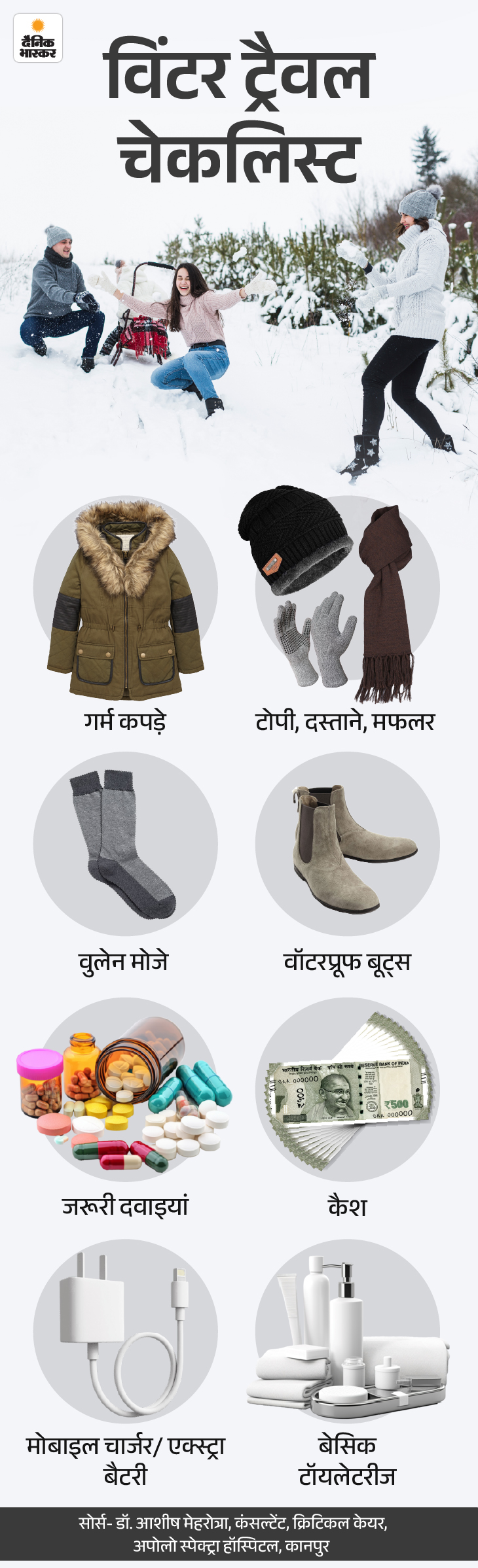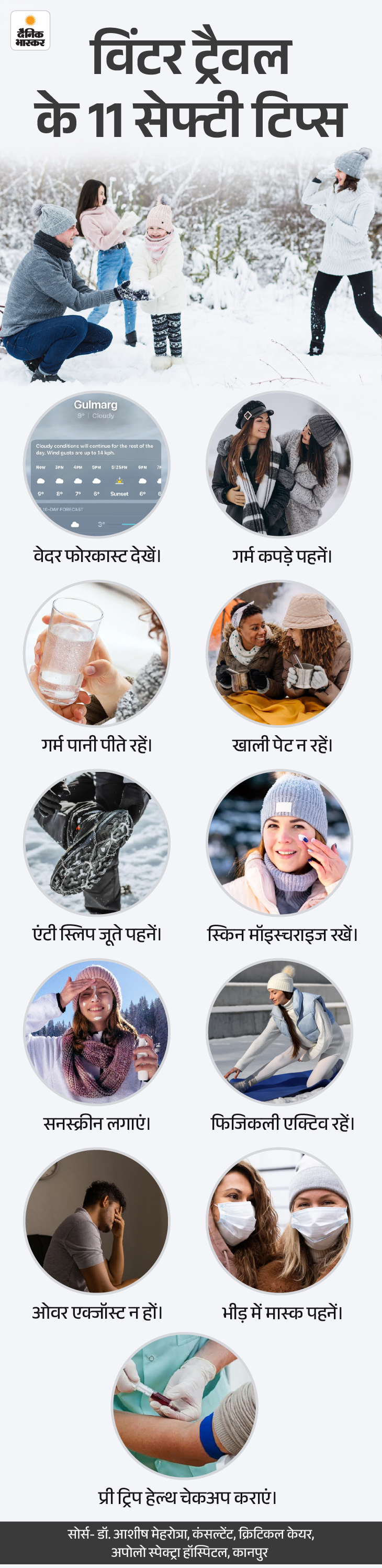 जवाब- कम तापमान, ठंडी हवा और बर्फीली सतहें सफर को चुनौतीपूर्ण बना सकती हैं, खासकर तब जब शरीर पहले से तैयार न हो। इस मौसम में शरीर को गर्म रखना, पानी पीते रहना और जरूरत से ज्यादा थकान से बचना बहुत अहम हो जाता है। छोटी लेकिन समझदारी भरी तैयारियां जैसे सही जूते, स्किन केयर और हेल्थ से जुड़ी सावधानियां जरूरी हैं। विंटर ट्रैवल पर निकलने से पहले कुछ बातों का ध्यान रखने से सफर न सिर्फ आसान होता है, बल्कि पूरी तरह एंजॉय भी किया जा सकता है। ग्राफिक से समझते हैं-