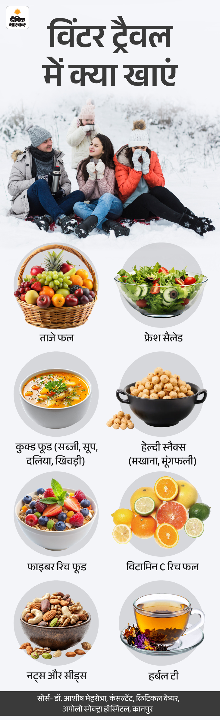 जवाब- ताजे फल, मौसमी सब्जियां, गरम सूप, दलिया और खिचड़ी शरीर को ऊर्जा और गर्माहट देते हैं। विटामिन C वाले फल जैसे संतरा, अमरूद, कीवी इम्यूनिटी बढ़ाते हैं। नट्स और बीज यात्रा में साथ रखें। बार-बार चाय-कॉफी या अल्कोहल लेने से डीहाइड्रेशन बढ़ सकता है, इसलिए इनसे दूरी बनाएं। गरम पानी हमेशा साथ रखें।