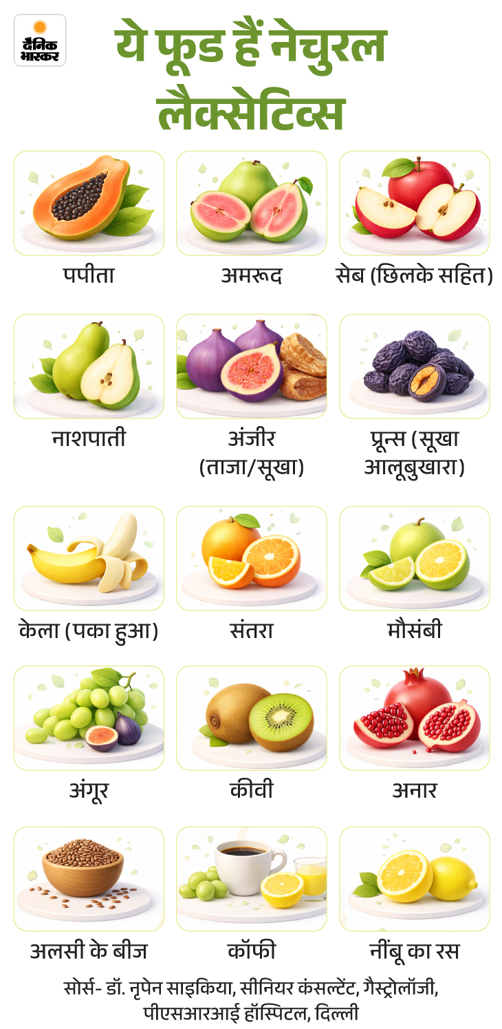 जवाब- नेचुरल लैक्सेटिव वो फाइबर रिच फूड होते हैं, जो पेट को साफ रखने में मदद करते हैं। ग्राफिक में नेचुरल लैक्सेटिव की लिस्ट देखिए-
