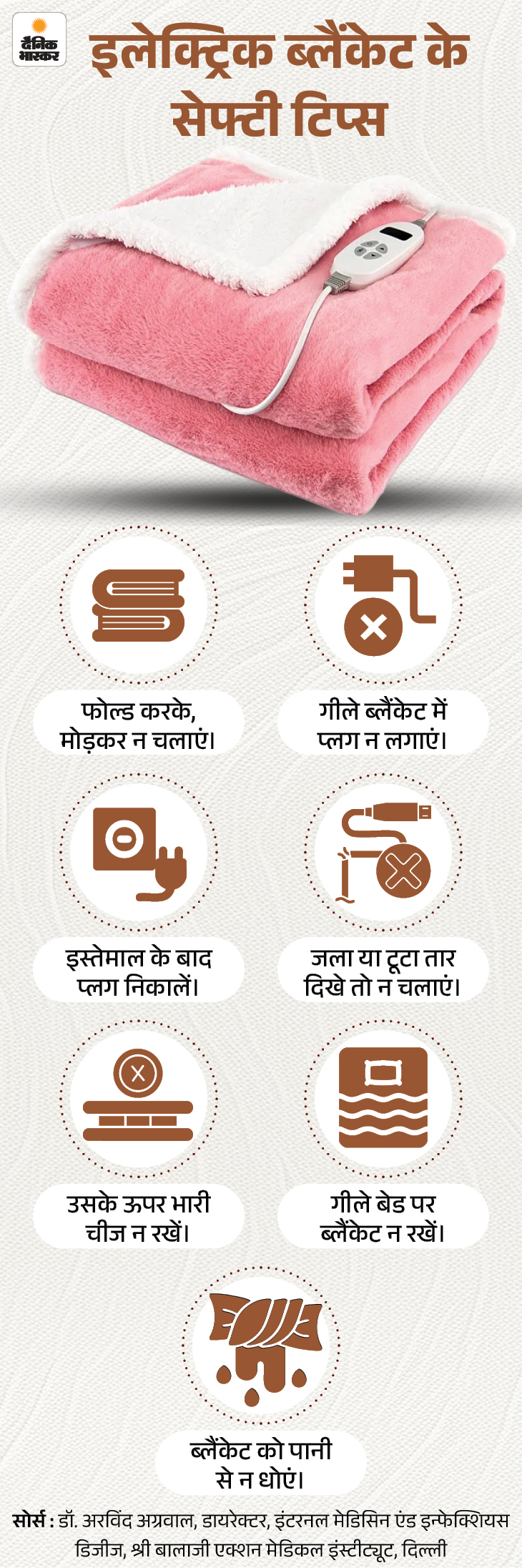 जवाब- सोते वक्त सीधी त्वचा पर संपर्क न होने दें। इसे फोल्ड करके इस्तेमाल न करें। सभी सेफ्टी टिप्स ग्राफिक में देखिए-