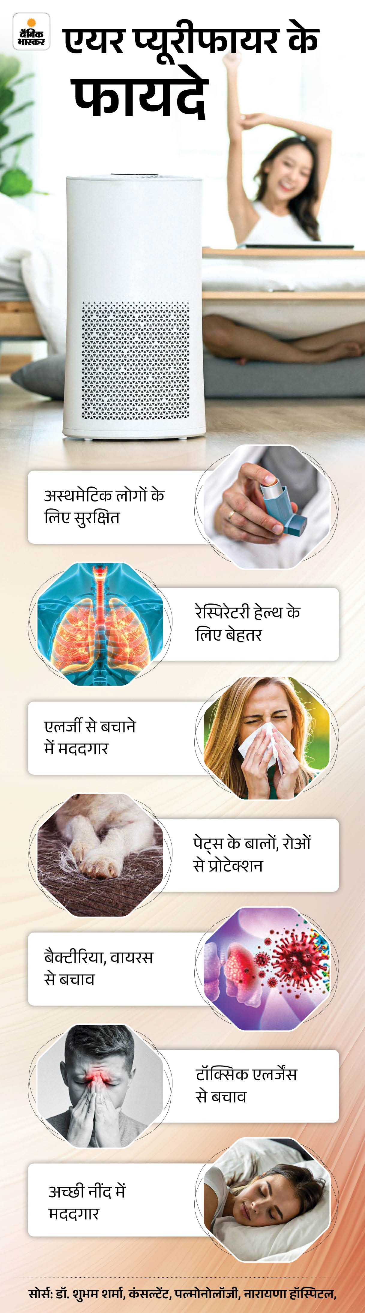 जवाब- एयर प्यूरीफायर इनडोर एयर को साफ बनाए रखने में मदद करते हैं। नीचे दिए ग्राफिक से इसके फायदे समझिए-