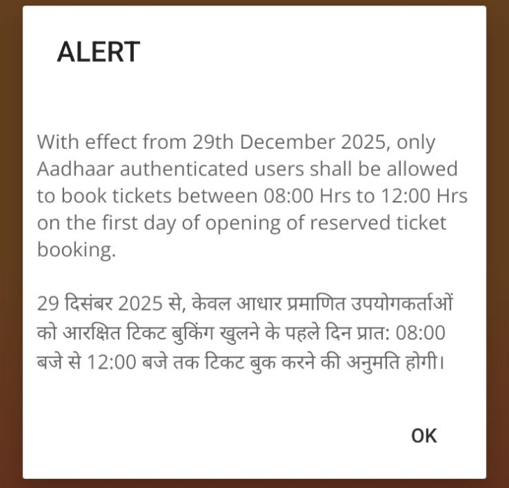 - 29 दिसंबर से बिना अधार सुबह 8 बजे से 12 बजे तक टिकट बुक नहीं होगी।