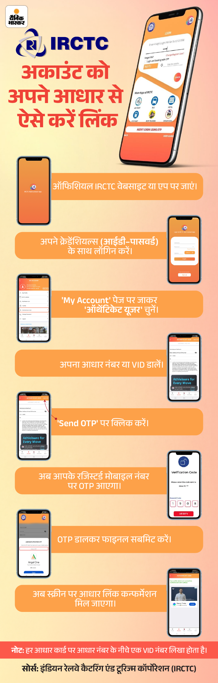 जवाब: हां, अगर आप ऑनलाइन टिकट बुक करना चाहते हैं, तो अपने IRCTC अकाउंट में आधार नंबर लिंक करना जरूरी है। आप IRCTC की वेबसाइट या ऐप पर लॉगिन करके “My Profile” सेक्शन में जाकर आधार डिटेल्स जोड़ सकते हैं। सुनिश्चित करें कि आपका मोबाइल नंबर आधार से लिंक हो, वरना OTP नहीं आएगा।