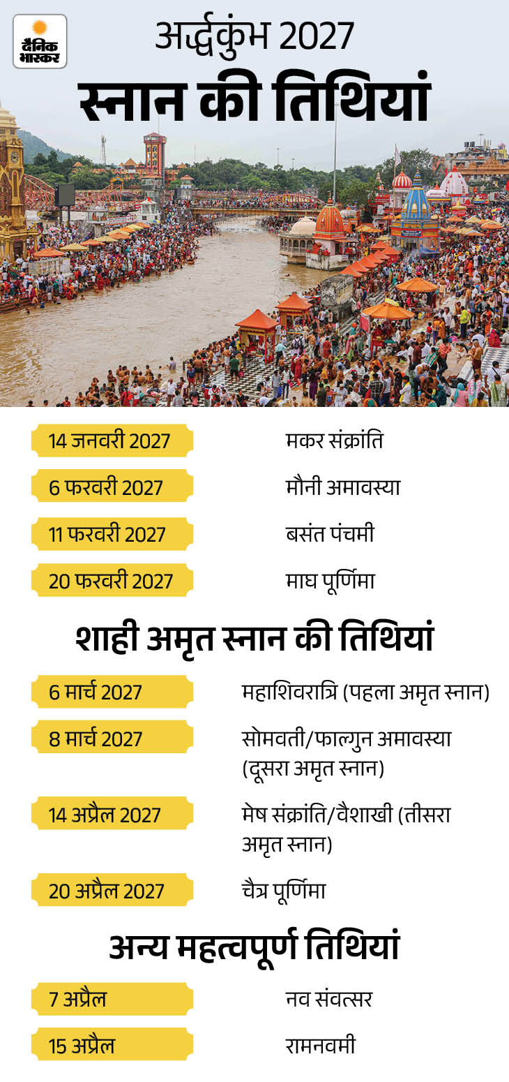 उत्तराखंड में 2027 में होने वाले अर्धकुंभ की तिथियां तय हो गई हैं। हरिद्वार में होने वाला ये भव्य आयोजन 14 जनवरी से शुरू होगा और 20 अप्रैल को खत्म होगा। 97 दिनों तक चलने वाले इस कार्यक्रम में 10 प्रमुख स्नान शामिल हैं। जिसमें पहली बार चार शाही अमृत स्नान भी होंगे, जिसे एक ऐतिहासिक फैसला माना जा रहा है। (यहां पढ़िए पूरी खबर)