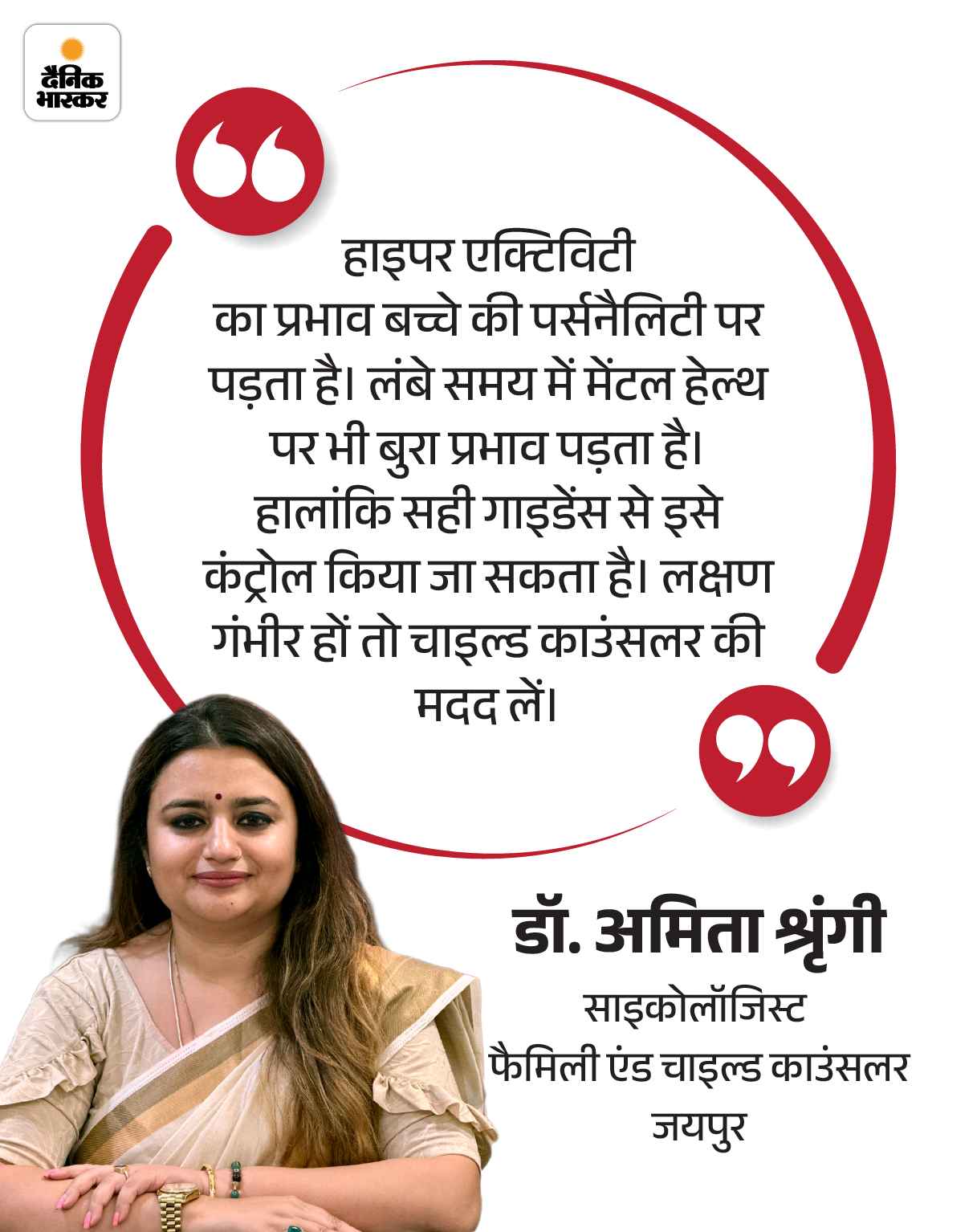 अंत में यही कहूंगी कि हाइपरएक्टिव बच्चे की परवरिश में थोड़ा ज्यादा समझ, धैर्य और दिशा देने की जरूरत होती है। बच्चे की ऊर्जा अगर सही दिशा में लगाई जाए तो वह उसकी सबसे बड़ी ताकत बन सकती है। इसलिए डांट या डर से नहीं, प्यार और समझ से उसके दिल तक पहुंचिए, क्योंकि सही पेरेंटिंग किसी भी हाइपरएक्टिव बच्चे को आत्मविश्वासी, संवेदनशील और सफल इंसान बना सकती है।
