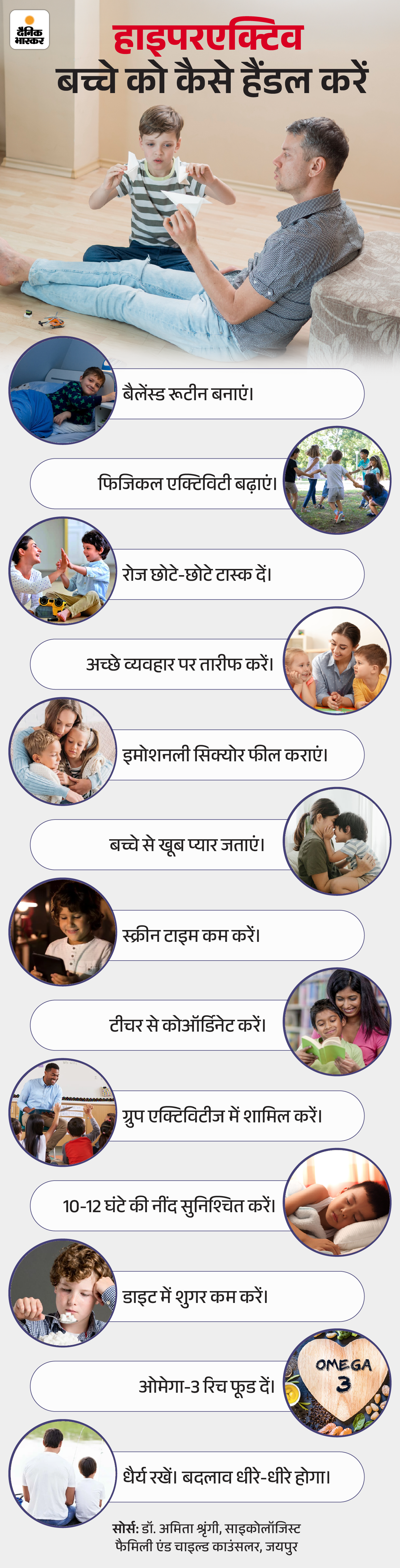 अगर बच्चे की हाइपर एक्टिविटी डेली रूटीन को प्रभावित कर रही है तो प्रोफेशनल हेल्प लें। चाइल्ड साइकोलॉजिस्ट या पीडियाट्रिशियन से इवैल्यूएशन कराएं। वे क्वेश्चनेयर और ऑब्जर्वेशन से इसे ठीक करेंगे। अगर लक्षण माइल्ड हैं तो घरेलू स्ट्रेटजीज से सुधार हो सकता है। इसके लिए कुछ बातों का ध्यान रखें।