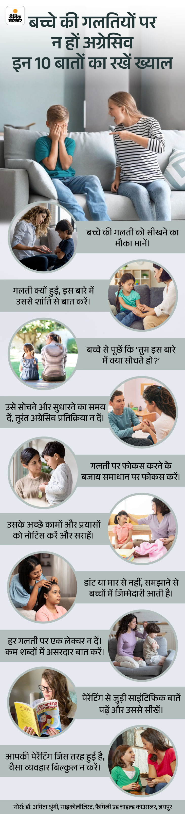 जब भी आप उसे किसी गलती के लिए टोकें तो केवल सजा न दें। उसे उसकी गलती का एहसास कराएं और ये भी महसूस कराएं कि उसने जो किया, वह क्यों ठीक नहीं था और अगली बार उसे कैसे सुधारे। जब वह अपनी गलती को खुद समझने और स्वीकारने लगेगा, तभी उसमें जिम्मेदारी और सेल्फ कंट्रोल की भावना विकसित होगी। इसके साथ ही पेरेंट्स अपने गुस्से पर भी कंट्रोल करना सीखें। इसके लिए 10 बातों का विशेष ख्याल रखें।