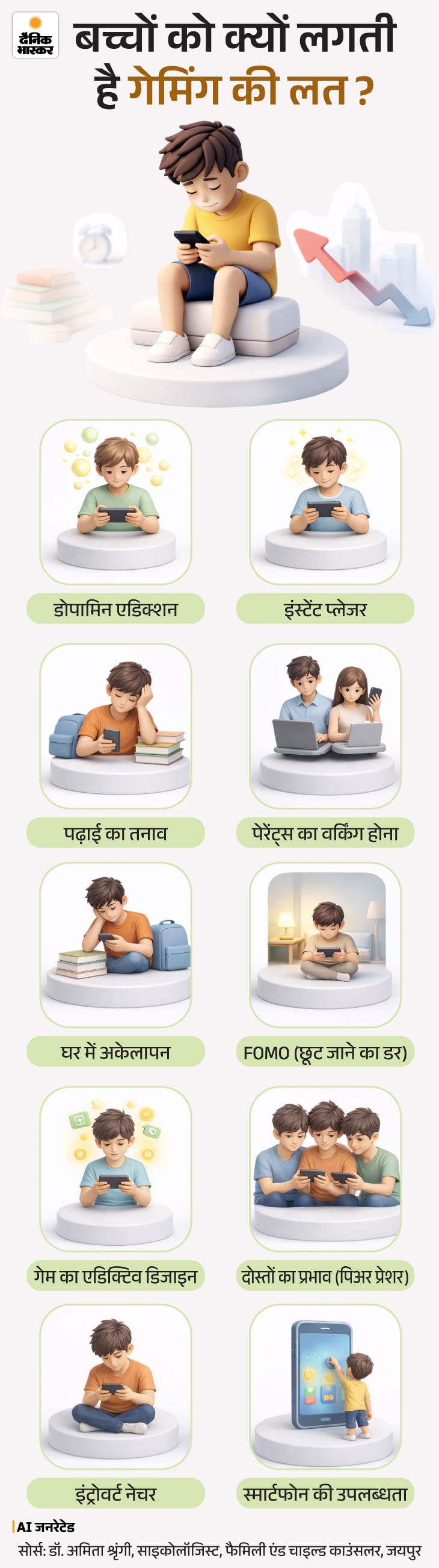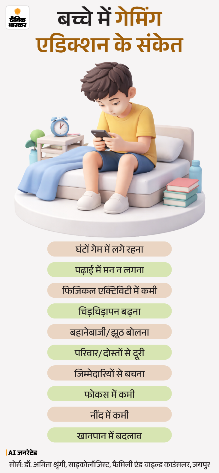 अगर बच्चे कभी-कभार मनोरंजन के लिए गेम खेलते हैं तो यह सामान्य है। लेकिन जब इससे बच्चे का व्यवहार, पढ़ाई, दिनचर्या और मूड प्रभावित होने लगे तो यह गेमिंग लत का संकेत है। इन संकेतों को नीचे ग्राफिक्स में देखें–