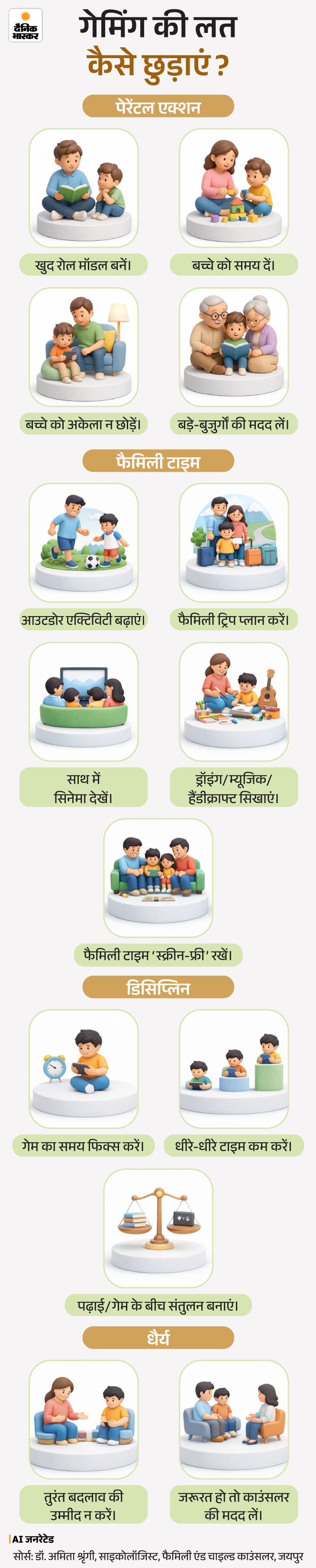 बच्चों को मोबाइल या गेम को पूरी तरह दूर करना सही नहीं है। इसलिए लक्ष्य यह नहीं होना चाहिए कि बच्चा गेम बिल्कुल न खेले, बल्कि यह होना चाहिए कि उसका स्क्रीन टाइम बैलेंस्ड रहे। आपने बताया कि टाइम की कमी थी तो आपने बच्चे को फोन पकड़ा दिया। लेकिन अब अगर आपको बच्चे को गेमिंग की लत से बचाना है तो उसे टाइम देना पड़ेगा। बच्चे काे गेम एडिक्शन से बचाने के लिए सबसे जरूरी है पेरेंट्स का समय देना।