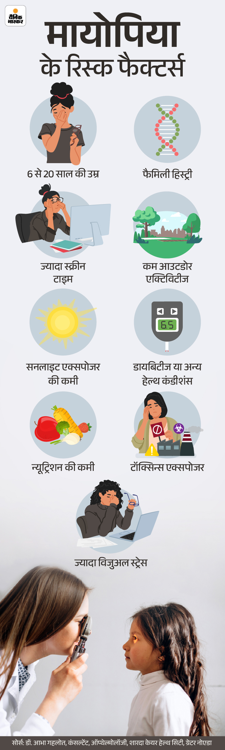 कम उम्र में शुरू होने वाला मायोपिया तेजी से बढ़ता है। अगर किसी बच्चे को 10 साल से पहले मायोपिया हो जाए तो हाई मायोपिया का रिस्क ज्यादा होता है। डायबिटिक बच्चों में भी ये बढ़ सकता है। ज्यादा विजुअल स्ट्रेस, जैसे कंप्यूटर पर लगातार काम, टेम्परेरी मायोपिया पैदा कर सकता है, जो स्थायी बन जाता है। घर से बाहर कम निकलना एक बड़ा फैक्टर है। जो बच्चे बाहर कम खेलते हैं, उन्हें रिस्क ज्यादा होता है।