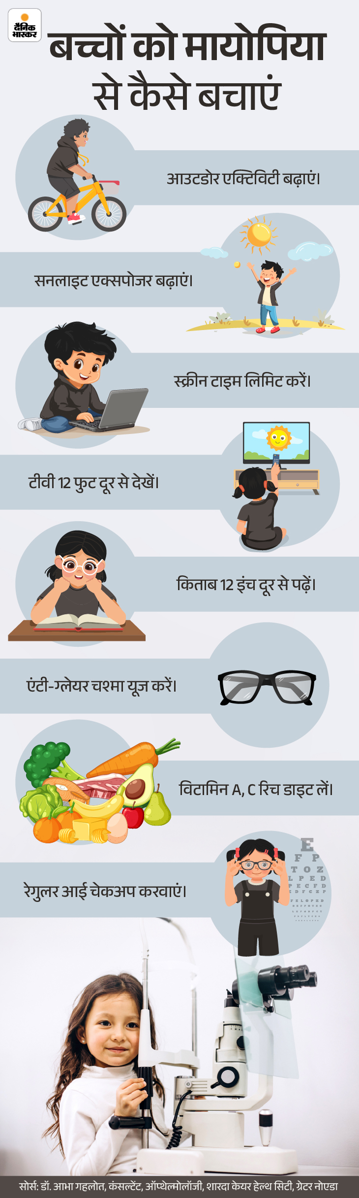 लाइफस्टाइल बदलाव: स्क्रीन टाइम कम करें। 20-20-20 रूल फॉलो- हर 20 मिनट में 20 सेकंड ब्रेक, 20 फीट दूर देखें। रोज 90 मिनट बाहर खेलें। विटामिन A और C रिच फूड- फल, सब्जियां, ओमेगा-3। धूम्रपान से दूर रहें।