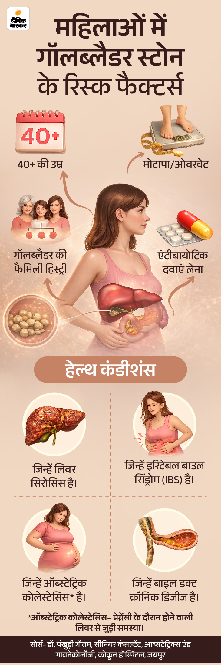 जवाब- कुछ कंडीशंस महिलाओं में गॉलब्लैडर स्टोन का रिस्क बढ़ा सकती हैं। नीचे दिए ग्राफिक्स से समझिए-
