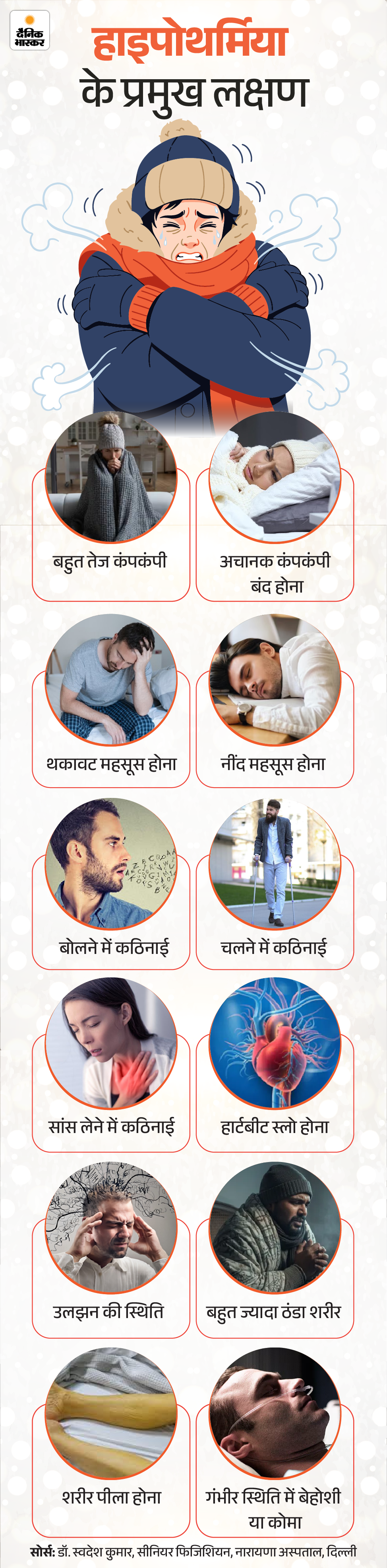 जवाब- शुरुआती लक्षणों में शरीर का कांपना सबसे आम संकेत है। यह बताता है कि शरीर गर्मी बनाए रखने की कोशिश कर रहा है। लेकिन जब ठंड बहुत बढ़ जाती है, तो यह कांपना रुक सकता है, जो कि खतरे का संकेत है। व्यक्ति को ज्यादा थकान, कमजोरी, नींद, उलझन होती है, बॉडी रिस्पांस धीमे होने लगते हैं। गंभीर मामलों में बेहोशी, दिल की धड़कन धीमी पड़ना और अंगों का काम करना भी बंद हो सकता है।