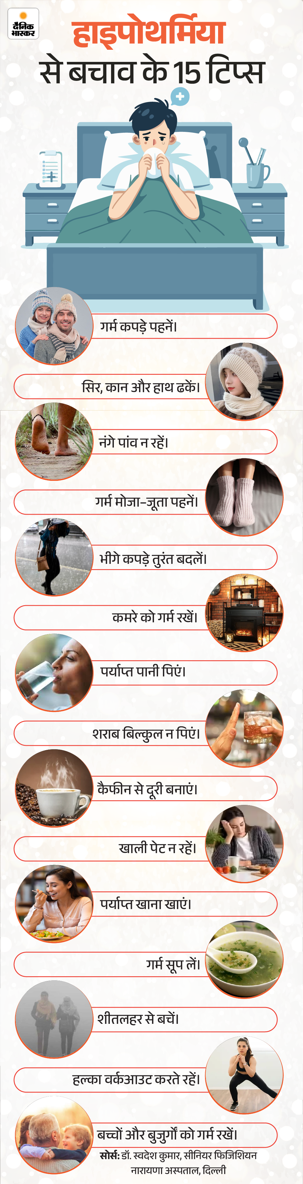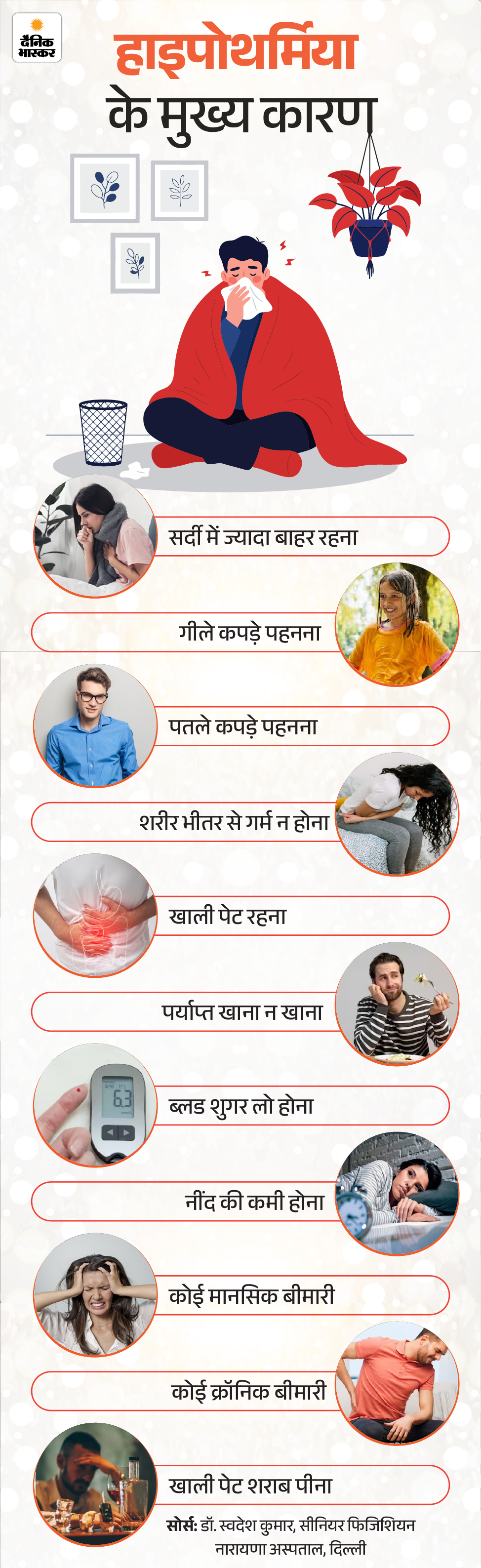 यही ठंड हाइपोथर्मिया नाम की गंभीर मेडिकल कंडीशन में बदल सकती है, जो इग्नोर किए जाने पर जानलेवा भी हो सकती है। एनवायर्नमेंट का तापमान कम होने से बॉडी टेम्परेचर तेजी से गिरने लगता है। अगर समय पर ध्यान न दिया जाए, तो कई बार शरीर अपने तापमान को नियंत्रित नहीं कर पाता और कार्डियक अरेस्ट हो सकता है।