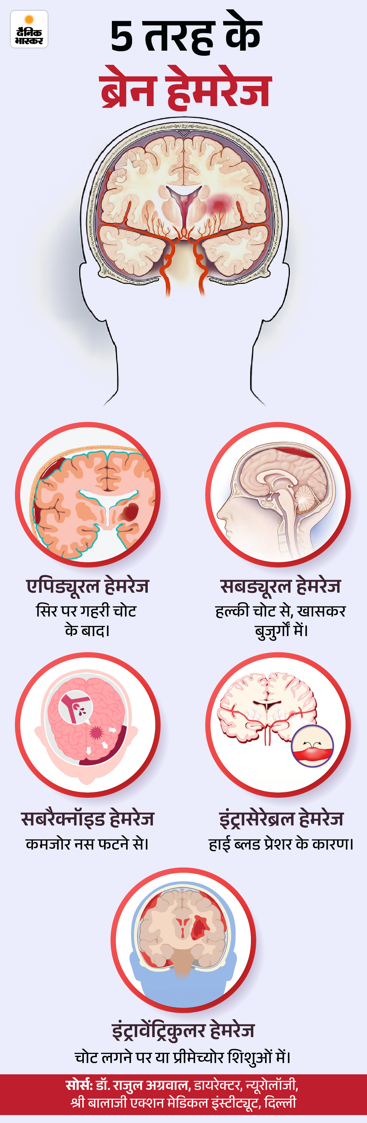 वहीं दो प्रकार के हेमरेज ब्रेन टिश्यू के अंदर होते हैं- इंट्रासेरेब्रल और इंट्रावेंट्रिकुलर। सभी तरह के ब्रेन हेमरेज और उनकी कॉमन वजह, ग्राफिक में देखिए-