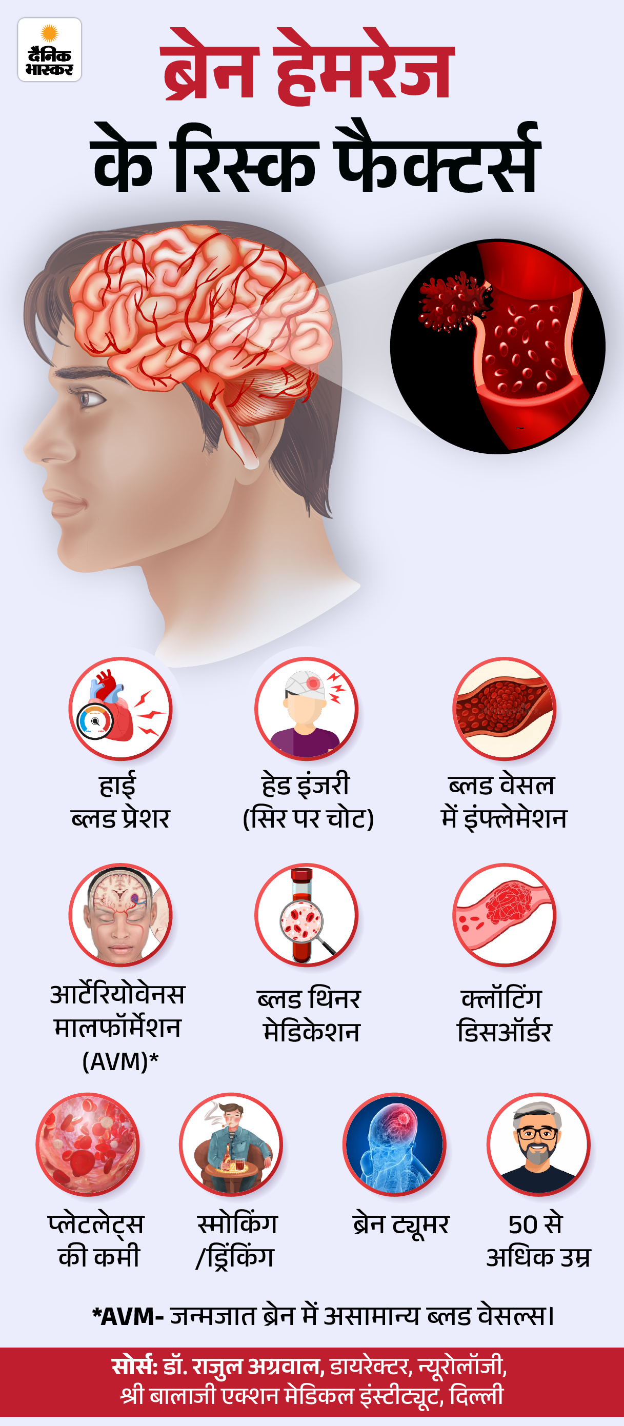जवाब- कुछ मेडिकल कंडीशंस और चोट के कारण ब्रेन हेमरेज का रिस्क बढ़ सकता है। अनियंत्रित हाई ब्लड प्रेशर, सिर पर गंभीर चोट, ब्रेन की नसें कमजोर होने (एन्यूरिज्म) या ब्लड क्लॉटिंग से इसका रिस्क बढ़ जाता है। सभी रिस्क फैक्टर्स ग्राफिक में देखिए-