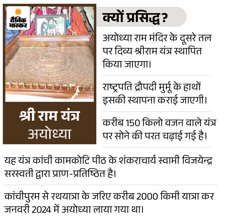 यंत्र 150 किलो वजनी, सोने की परत चढ़ी है करीब 150 किलोग्राम वजन वाले इस श्रीराम यंत्र पर सोने की परत चढ़ाई गई है। इसे कांचीपुरम मठ के मुख्यालय में स्थापित प्राचीन यंत्र के आधार पर तैयार किया गया है।