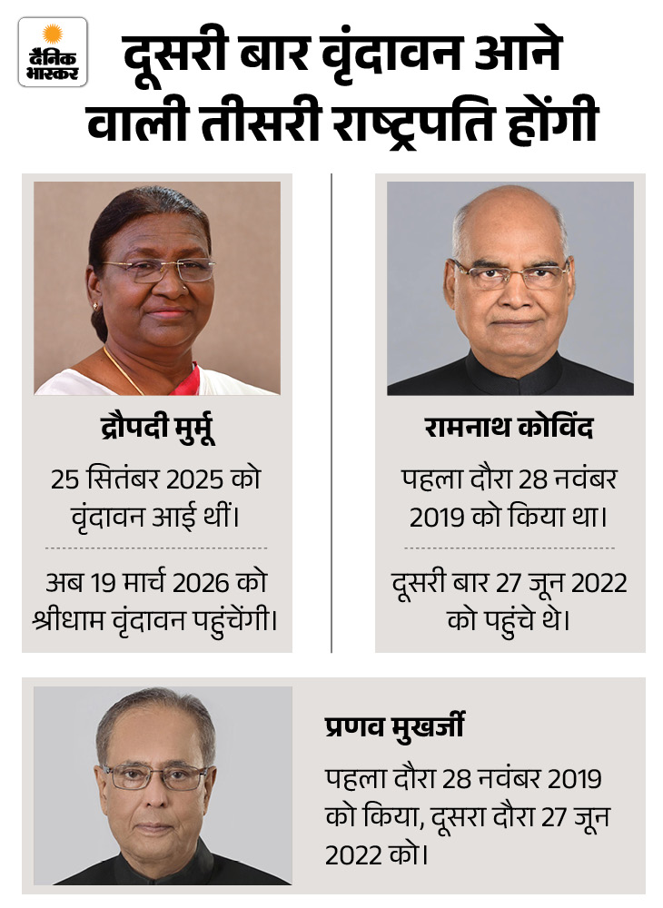 राष्ट्रपति सबसे पहले इस्कॉन मंदिर जाएंगी अयोध्या से 19 मार्च को ही राष्ट्रपति द्रौपदी मुर्मू सेना के हेलीपैड से नेशनल हाईवे होते हुए शाम करीब 5:35 पर वृंदावन स्थित रेडिसन होटल आएंगी। यहां से वह शाम 6:30 बजे इस्कॉन मंदिर जाएंगी। जहां वह एक घंटे तक रहेंगी। यहां वह भगवान कृष्ण- बलराम, राधा-कृष्ण और निताई गौर के दर्शन करेंगी। मुर्मू वृंदावन दो बार आने वाली तीसरी राष्ट्रपति हैं।