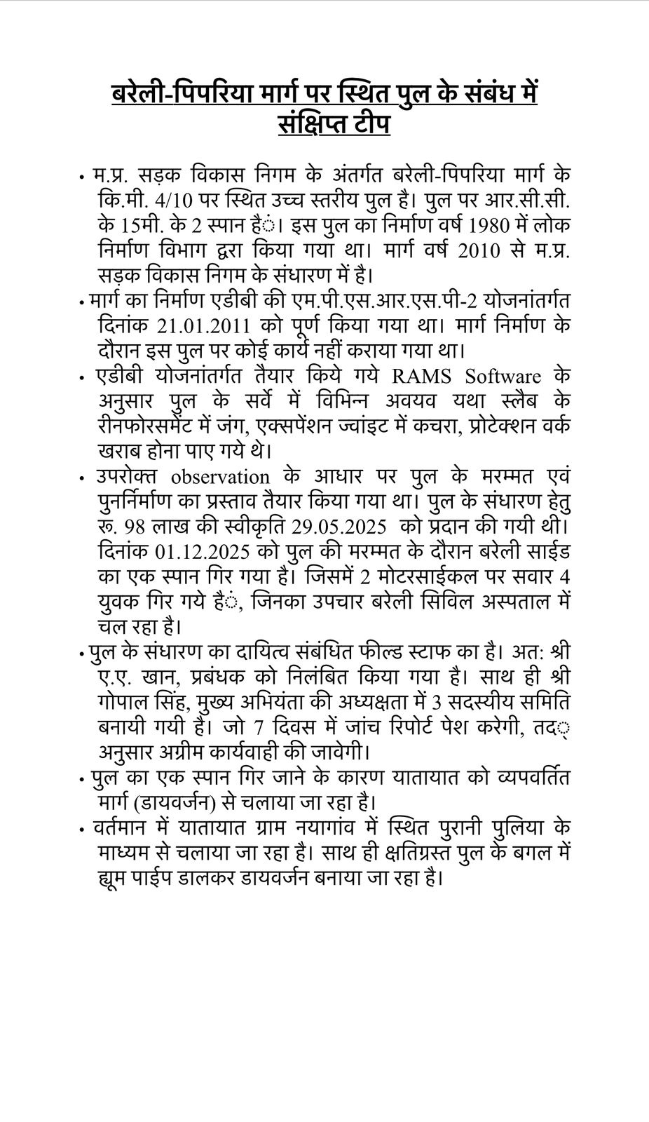 Raisen Pul Hadsa Live : रायसेन में पुल टूटने के मामले में लापरवाही उजागर हुई. फील्ड स्टाफ के प्रबंधक ए ए खान को निलंबित कर दिया गया है. मुख्य अभियंता गोपाल सिंह के नेतृत्व में तीन सदस्यीय जांच दल बनाया गया है, जो सात दिन में रिपोर्ट सौंपेगा. एमपी सड़क विकास निगम पुल और सड़क के रखरखाव की जिम्मेदारी संभाल रहा था.