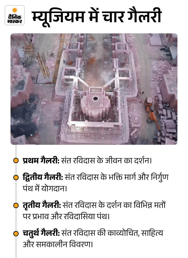 चार गैलरी का बनाया जा रहा है म्यूजियम संत रविदास मंदिर का निर्माण नागर शैली में पत्थरों से किया जा रहा है। साथ ही संस्कृति व रचनात्मक विशेषता के साथ संत रविदास के दर्शन को प्रदर्शित करने वाली एक विशेष शैली के इंटरप्रिटेशन म्यूजियम का निर्माण भी किया जा रहा है। म्यूजियम 20,500 वर्गफीट में बन रहा है, जिसमें चार गैलरी भी बनाई गई हैं।
