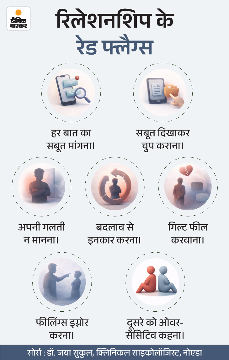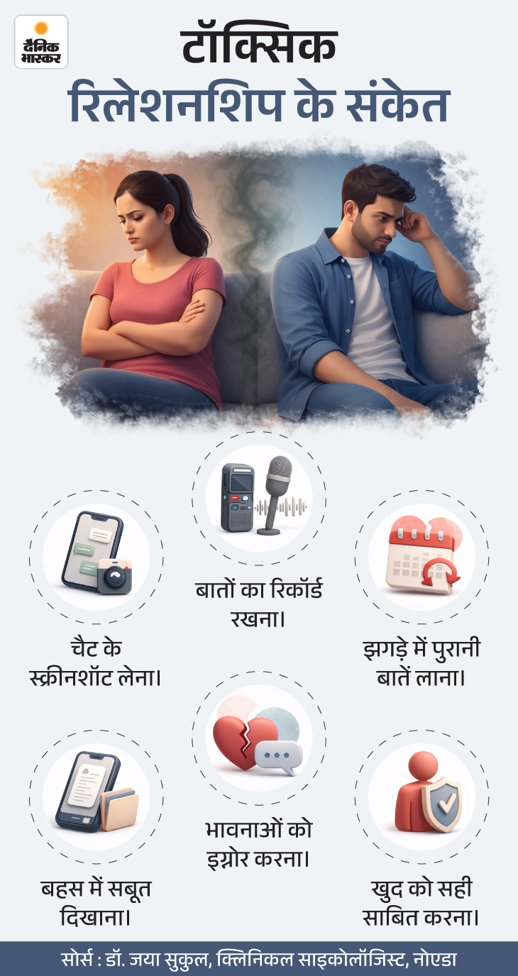 अगर कोई पार्टनर बातचीत के स्क्रीनशॉट संभालकर रखता है और झगड़े के समय उन्हें दिखाता है, तो यह हेल्दी पैटर्न नहीं है। रिकॉर्ड्स कोर्टरूम में जरूरी होते हैं क्योंकि वहां जज को सच और झूठ तय करने के लिए सबूत चाहिए। लेकिन ये समझना चाहिए कि रिश्ता कोर्टरूम नहीं है। इसलिए इसमें सबूत नहीं, समझ, भरोसा और भावनाओं की जरूरत होती है। इस तरह का बिहेवियर टॉक्सिक हो सकता है। इसके सभी संकेत ग्राफिक में देखिए-