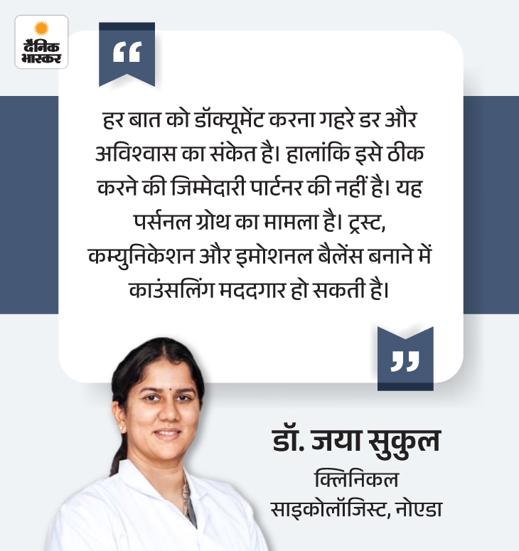 अगर कोई इंसान रिश्ते में रहते हुए भी हर बात का रिकॉर्ड रखने की जरूरत महसूस करता है, तो यह संकेत है कि उसके अंदर डर और अविश्वास जैसी भावनाएं बहुत गहरे बैठी हैं। इसके लिए उसे प्रोफेशनल हेल्प और काउंसलिंग की जरूरत है।