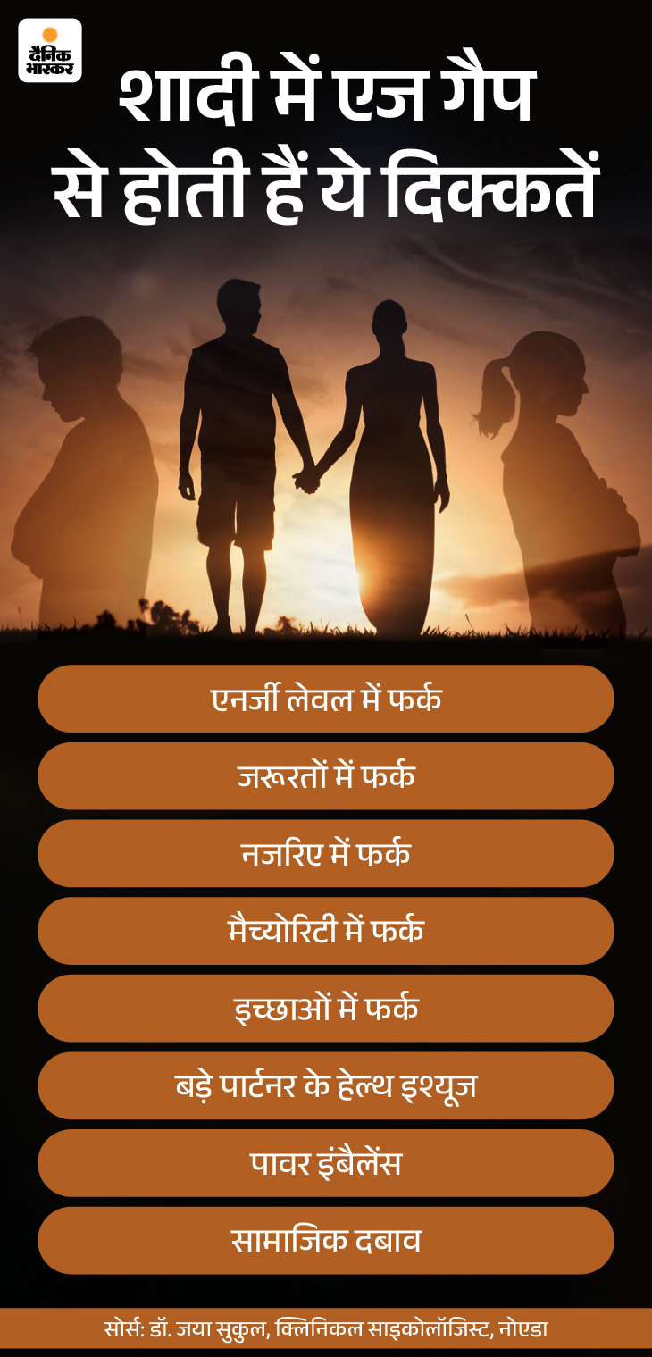 मान लीजिए आप तेज रफ्तार वाली कार में सवार हैं, लेकिन आपका पार्टनर आराम से साइकिल चला रहा है। बड़े एज गैप वाली शादियों में यही होता है। शुरुआती सालों में संतुष्टि ज्यादा होती है, क्योंकि छोटे पार्टनर को परिपक्वता आकर्षित करती है। लेकिन 5-10 साल बाद, जैसे आपकी शादी में फर्क दिखने लगता है। एनर्जी लेवल मैच नहीं करता, इच्छाएं अलग हो जाती हैं। रिसर्च से पता चलता है कि 3 साल से ज्यादा एज गैप में डिप्रेशन का खतरा बढ़ता है, और रिश्ता कम संतोषजनक लगने लगता है।