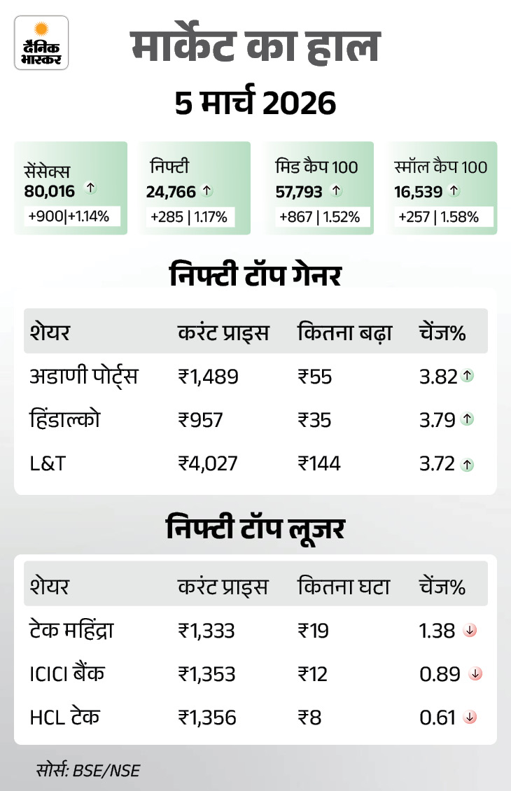 शेयर बाजार में कल यानी 5 मार्च को बढ़त रही। सेंसेक्स 900 अंक (1.14%) की तेजी के साथ 80,016 पर बंद हुआ। निफ्टी में भी 285 अंक (1.17%) की बढ़त रही। ये 24,766 के स्तर पर बंद हुआ।ऑटो, मेटल, फार्मा और एनर्जी शेयर्स में बढ़त रही।
