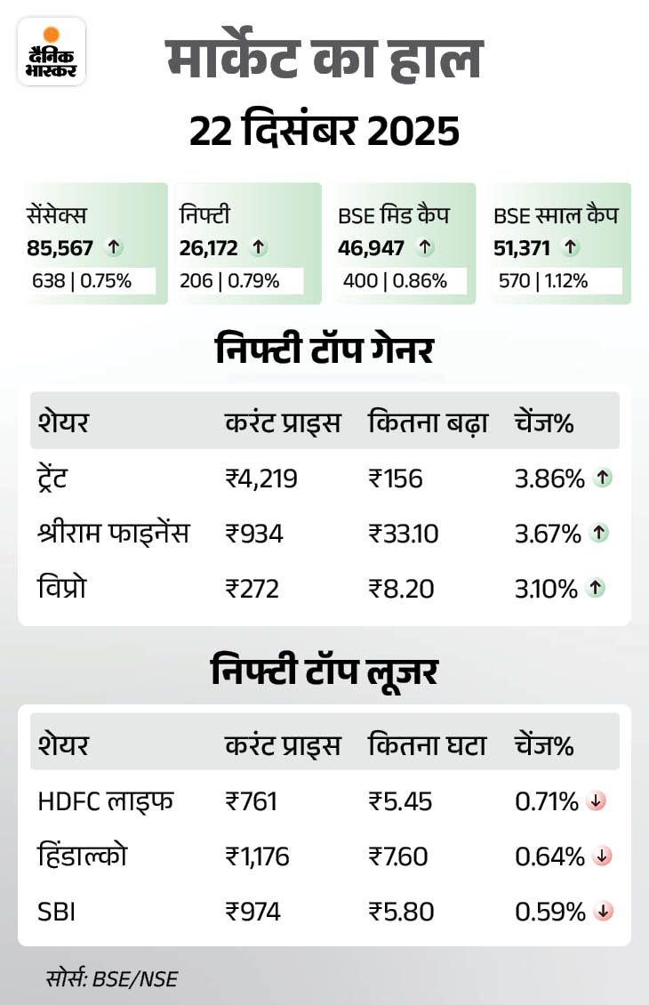 हफ्ते के पहले कारोबारी दिन सोमवार 22 जनवरी को शेयर बाजार में तेजी रही। सेंसेक्स 638 अंक चढ़कर 85,567 पर बंद हुआ है। निफ्टी में भी 206 अंक की तेजी रही, ये 26,172 पर बंद हुआ। आज के कारोबार में मेटल और आईटी शेयरों में सबसे ज्यादा खरीदारी रही। इसके अलावा बैंक और फार्मा शेयर भी चढ़े।