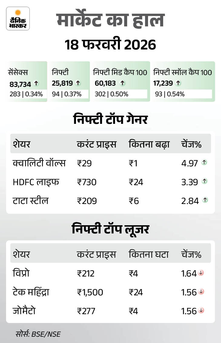 कल बाजार में रही थी बढ़त इससे पहले कल यानी 18 फरवरी को शेयर बाजार में बढ़त रही थी। सेंसेक्स 283 अंक की तेजी के साथ 83,734 पर बंद हुआ था। वहीं निफ्टी में भी 94 अंक की बढ़त है, ये 25,819 पर बंद हुआ था।