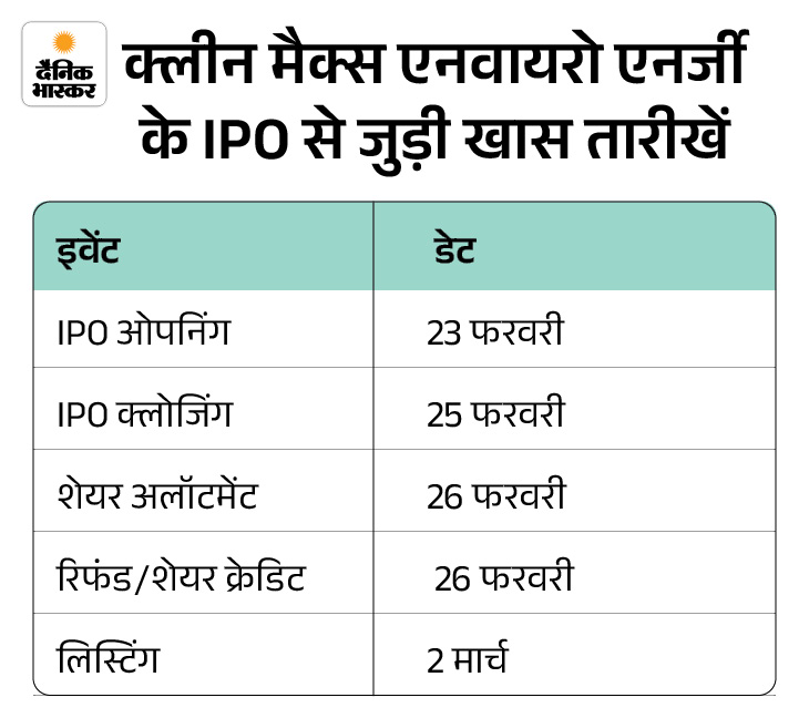 क्लीनमैक्स एनवायरो एनर्जी का IPO 23 फरवरी से ओपन होगा रिन्यूएबल एनर्जी कंपनी क्लीन मैक्स एनवायरो एनर्जी सॉल्यूशंस अपना इनिशियल पब्लिक ऑफर (IPO) 23 फरवरी को खुलेगा। निवेशक 25 फरवरी तक इसमें बोली लगा सकेंगे। कंपनी इस IPO के जरिए 3,100 रुपए जुटाना चाहती है। कंपनी इस इश्यू के जरिए फ्रेश शेयर और ऑफर फॉर सेल (OFS) दोनों लेकर आ रही है।