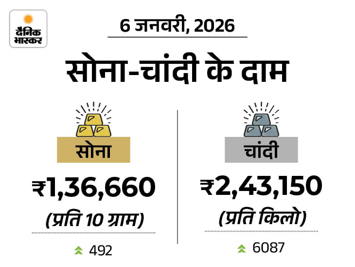 वहीं 10 ग्राम 24 कैरेट सोने का भाव 492 रुपए बढ़कर 1,36,660 रुपए पर पहुंच गया है। इससे पहले सोमवार को यह 1,36,168 रुपए पर था। वहीं सोना 29 दिसंबर 2025 को 1,38,161 रुपए के ऑल टाइम हाई पर पहुंचा था।