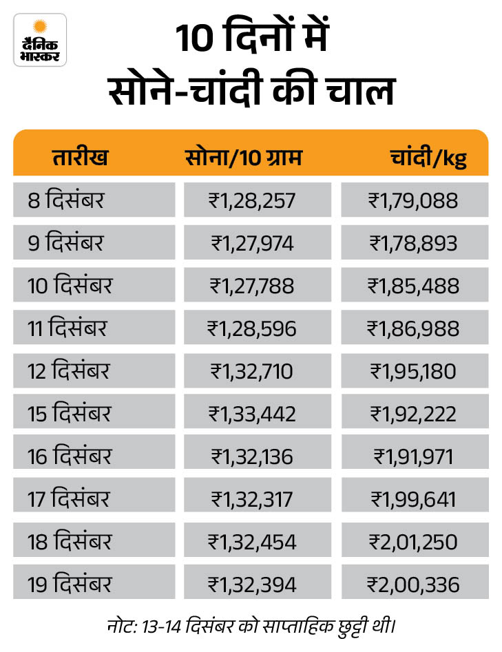 गुरुवार को इसकी कीमत 1,32,474 रुपए प्रति 10 ग्राम थी। इससे पहले 15 दिसंबर को सोने की कीमत 1,33,249 रुपए के अपने अब तक के सबसे ऊंचे स्तर पर थी।