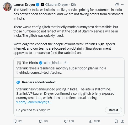 स्पेसएक्स की वाइस प्रेसिडेंट लॉरेन ड्रेयर ने X पर पोस्ट शेयर कर बताया, ‘स्टारलिंक इंडिया वेबसाइट अभी लाइव नहीं हुई है। प्राइसिंग भी अनाउंस नहीं की गई हैं और हम अभी इंडियन कस्टमर्स से कोई ऑर्डर नहीं ले रहे हैं।