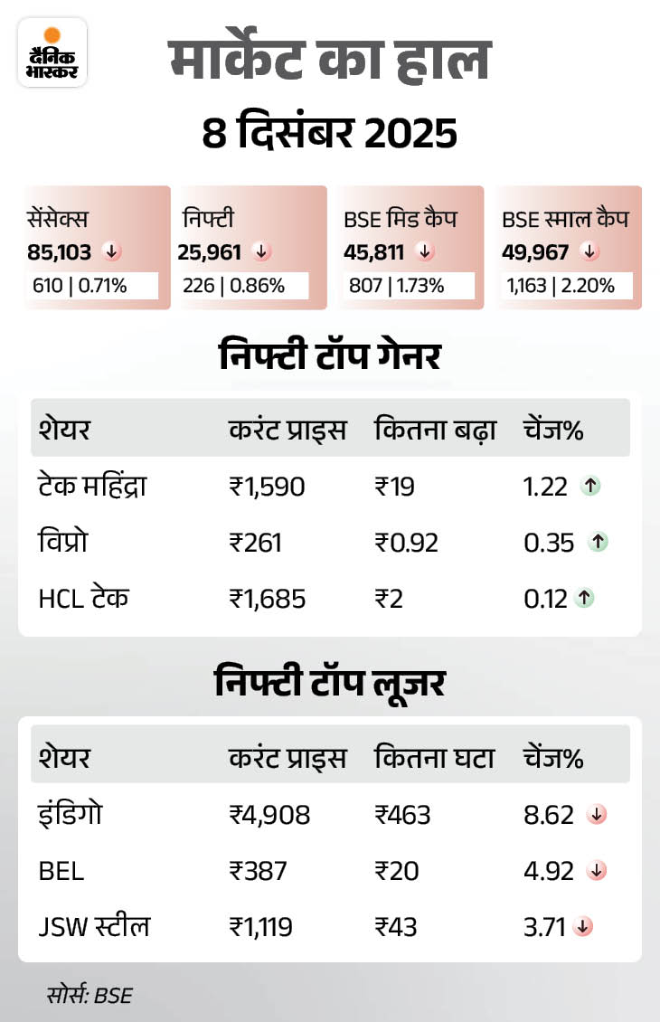 • सोमवार, 8 दिसंबर को भी शेयर बाजार में गिरावट देखने को मिली थी। सेंसेक्स 610 अंक (0.71%) गिरकर 85,103 पर बंद हुआ। निफ्टी में भी 226 अंक (0.86%) नीचे 25,961 के स्तर पर बंद हुआ था।