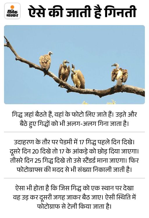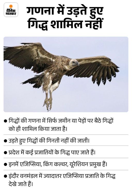 जानिए क्यों चुने दिन और क्या थी तकनीक दरअसल जहां गिद्धों की बसेरा (ऊंची पहाडी, चट्टान, किले आदि) वहां सुबह 6.30 बजे वन विभाग की टीमें पहुंच गई। इन्हें दो घंटों में इनकी गिनती करने को कहा गया था। इसका बड़ा कारण यह है कि गिद्धों की प्रकृति यह है कि उन्हें सुबह धूप खिलने के बाद गर्मी मिलती है तो उनमें ऊर्जा आती है। इसके बाद वे उड़ते हैं और अगर तापमान अच्छा नहीं रहा तो वे अपने पंख आसानी से फैला नहीं पाते। ऐसे में सुबह का यही दो घंटे का समय होता है जब वे अपने ठिकानों पर बैठे रहते हैं। इस दौरान उनके स्थान पर उनकी गिनती की गई। हालांकि इस बार इस बार 20 फरवरी को पहले दिन कई स्थानों पर बारिश हुई जिससे देर से गिनती हुई। इंदौर वन मंडल में ट्रेचिंग ग्राउण्ड, मोहाडी फॉल, चोरल आदि क्षेत्र में टीमें तीनों दिन समय पर पहुंच गई थी।