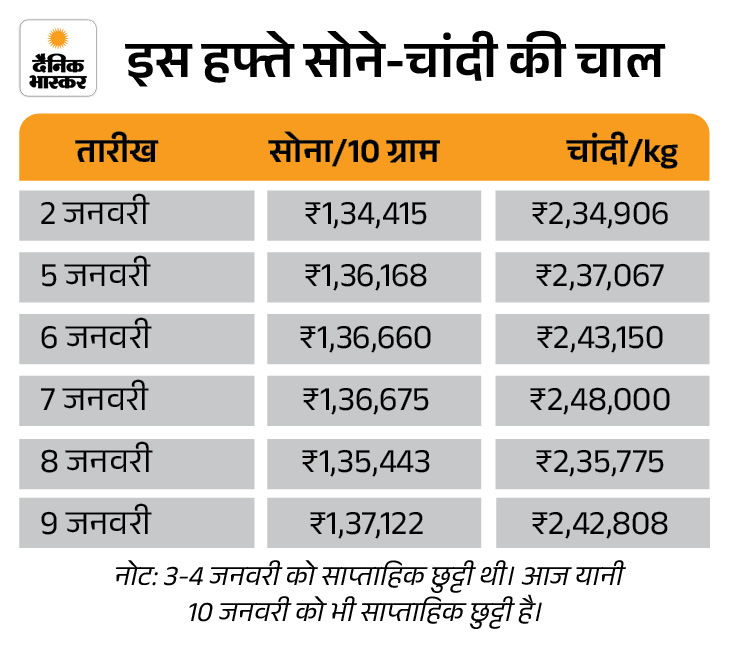इस हफ्ते सोने-चांदी के दाम में बढ़त रही। सोना 2,340 रुपए बढ़कर 1,37,122 रुपए प्रति 10 ग्राम पर पहुंच गया है। इससे पहले ये बीते हफ्ते यानी 2 जनवरी, शुक्रवार को 1,34,782 रुपए पर था। वहीं चांदी 2,34,550 किलो से बढ़कर 2,42,808 रुपए पर पहुंच गई है। यानी इसकी कीमत 8,258 रुपए बढ़ी है।