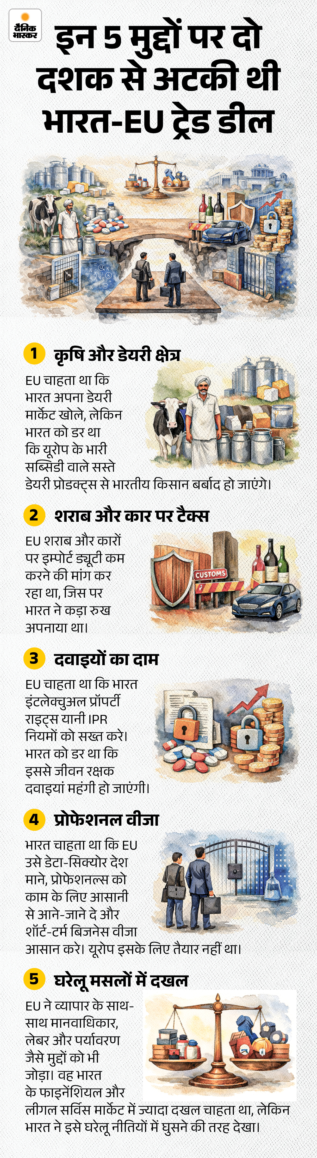 भारत और EU के बीच ट्रेड डील पर बातचीत 2007 में शुरू हुई थी, लेकिन 2013 में रुक गई। वजह ये थी कि कई बड़े मुद्दों पर दोनों की सहमति नहीं बन पाई। EU चाहता था कि भारत खेती और डेयरी सेक्टर खोले, लेकिन भारत को डर था कि इससे किसानों को नुकसान होगा। शराब और कारों पर टैक्स घटाने की मांग पर भी भारत तैयार नहीं हुआ।