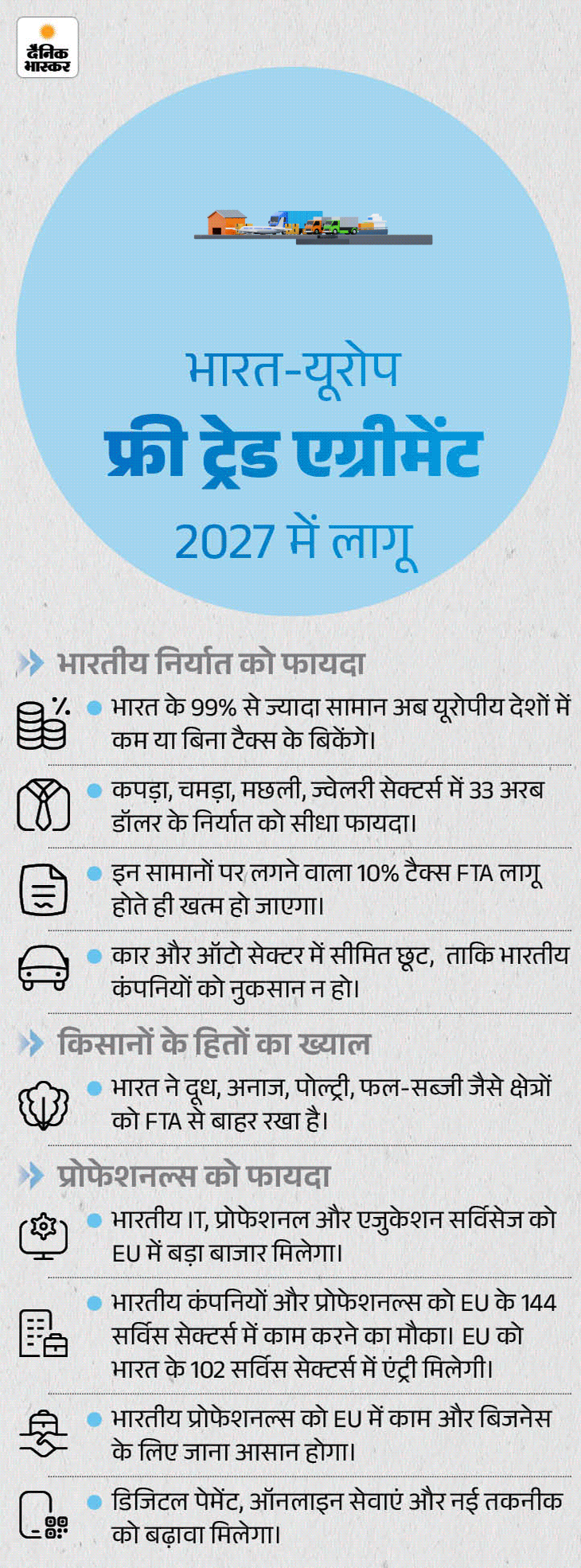 इस फ्री ट्रेड समझौते में कृषि और डेयरी जैसे सेक्टर को बाहर रखा गया है। भारत को डर है कि यूरोपीय कृषि प्रोडक्ट्स से उसके किसानों की इनकम पर असर पड़ सकता है। वहीं EU भी अपने किसानों को लेकर सतर्क है, इसलिए इन मुद्दों को समझौते में शामिल नहीं किया गया है।