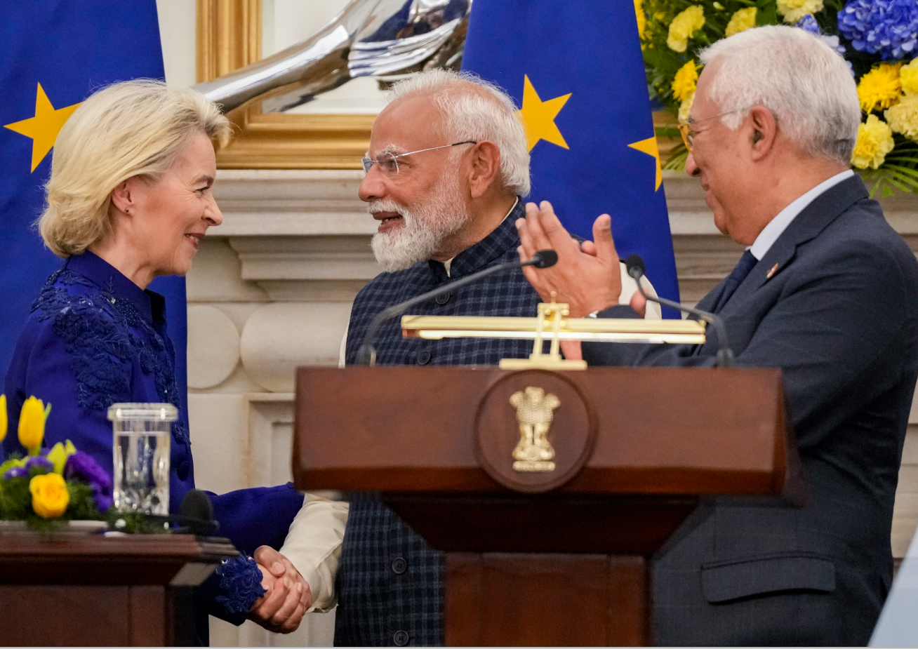 पीएम मोदी, यूरोपीय आयोग की अध्यक्ष उर्सुला वॉन डेर लेयेन और यूरोपीय परिषद के अध्यक्ष एंटोनियो कोस्टा ने भारत-EU फ्री-ट्रेड एग्रीमेंट की वार्ता के समापन की घोषणा की।
